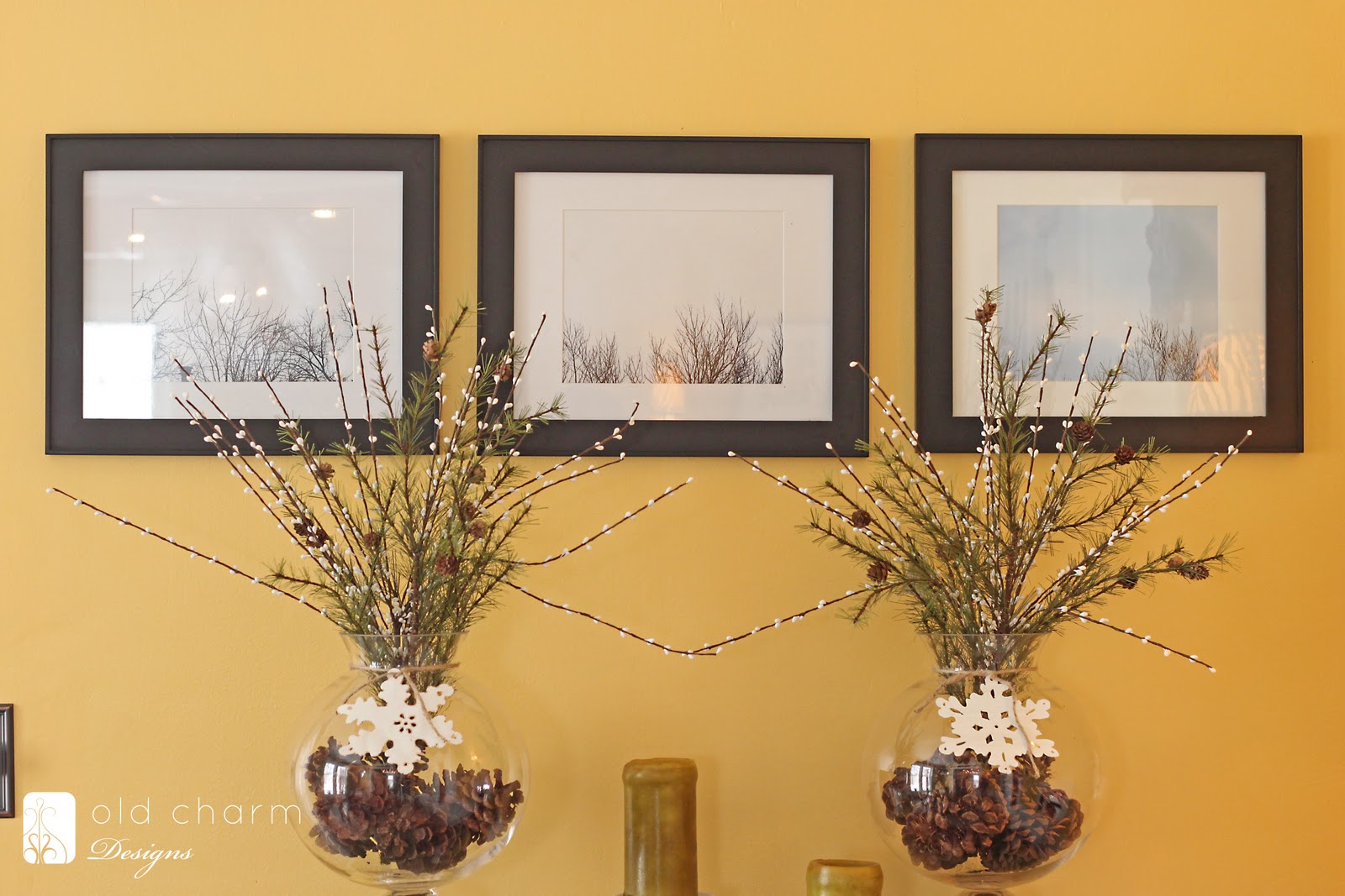 i filled the glass globe jars with pinecones and tied on a metal snowflake with some twine.