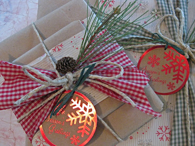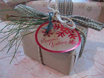 to finish things off i then wrapped the package with some hemp twine. again, use what you have. baker’s twine would be perfect too. when tying the twine i slipped in a piece of artificial pine… you could use a flower, a homemade pom-pom, an ornament, cookie cutter, etc. again… use what you have. i added a matching tag and that’s it! very original gift. almost too pretty to open.