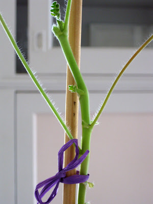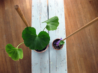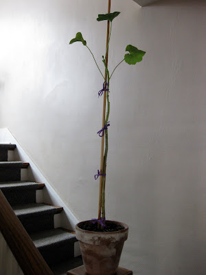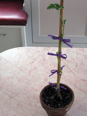 Anyway, last summer I saw a picture of a geranium topiary in Cottage Living magazine. I was inspired, I had to have one! So at the end of summer I looked through all my geraniums to find one with a somewhat straight stems. Success! I found one. I transplanted it into a pot and cared for it all winter long.